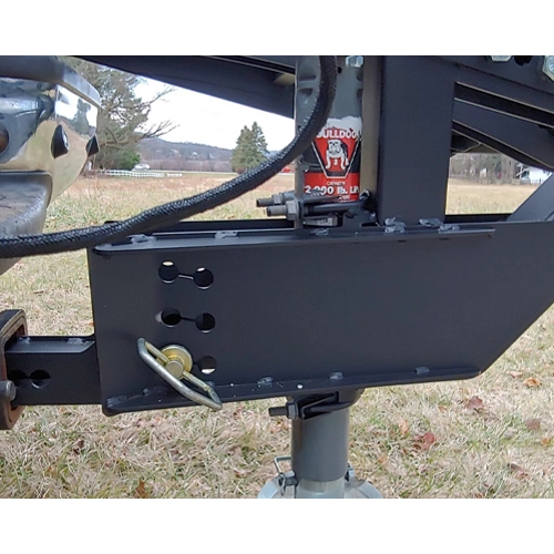 To remove the Ramp Rack, open the ramp, lock it in place, and then disconnect the ramp from the truck. Next, extend the adjustable jack by cranking the quick disconnect handle until it supports the ramp’s weight. Then, remove the linchpin and drive the truck forward.